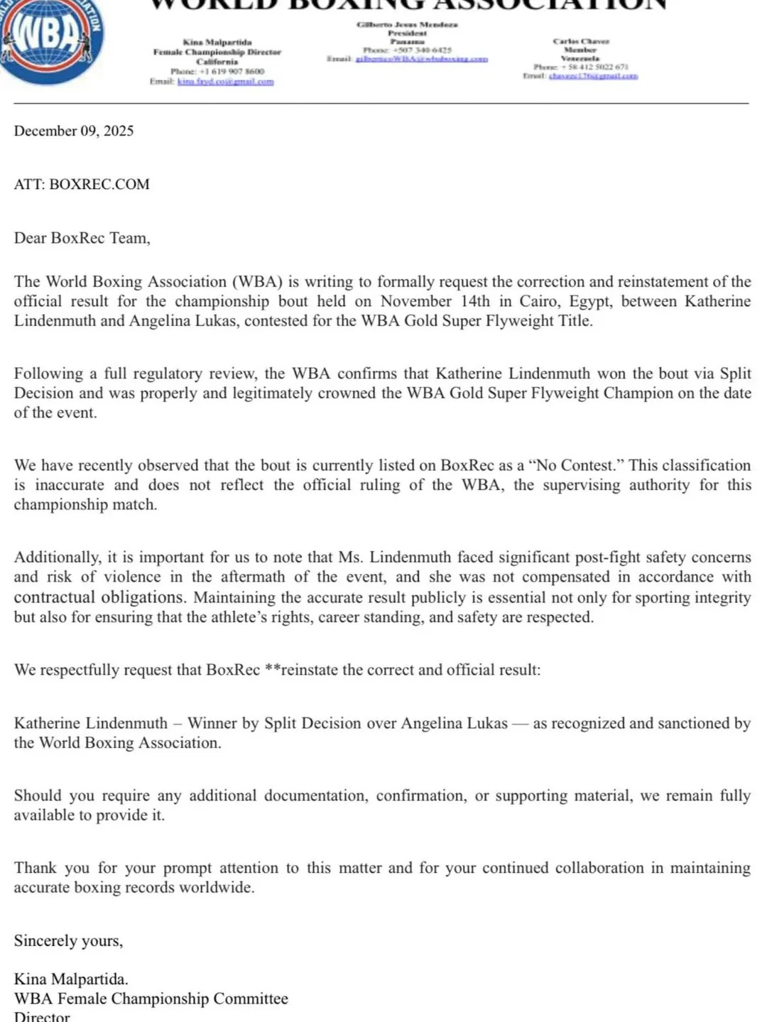 Всемирная боксёрская ассоциация (WBA) настоящим официально запрашивает корректировку и восстановление официального результата титульного боя, прошедшего 14 ноября в Каире, Египет, между Кэтрин Линденмут и Ангелиной Лукас, где разыгрывался титул чемпиона WBA Gold во втором наилегчайшем весе.