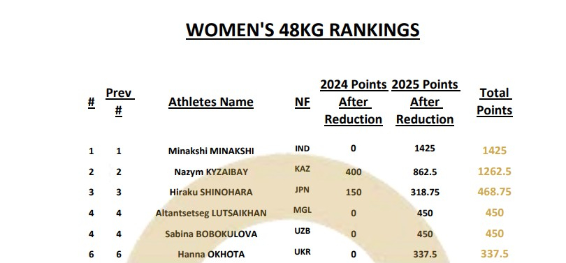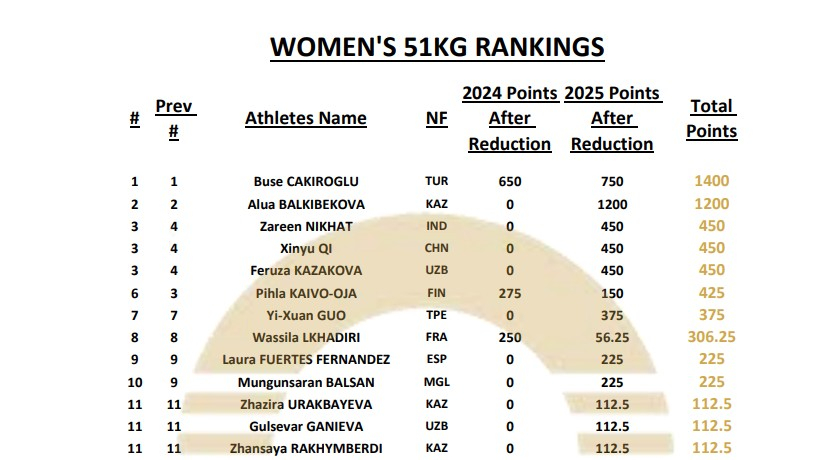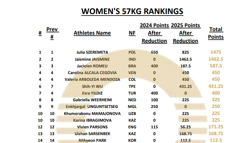 В категории до 57 килограммов десятой идет Карина Ибрагимова, в списке также находятся Улжан Сарсенбек и Айдана Забынбекова.