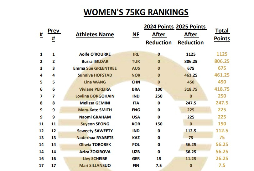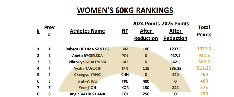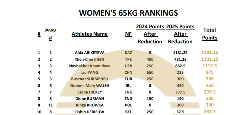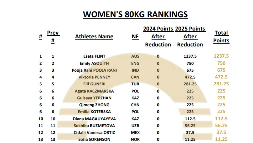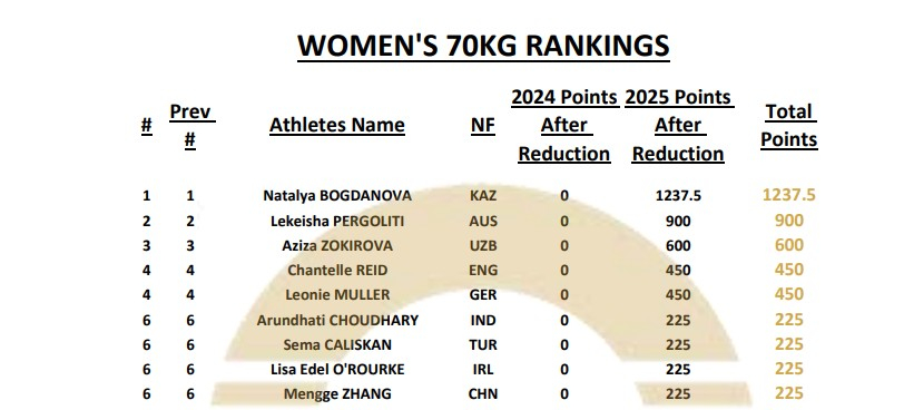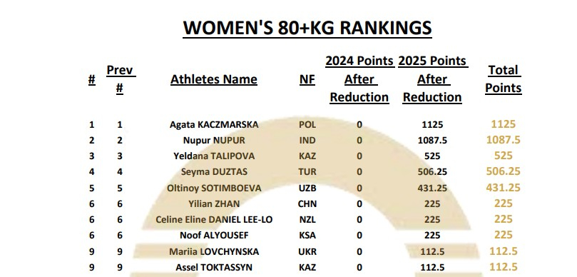 В категории свыше 80 килограммов третье место занимает Елдана Талипова. Также в рейтинге присутствует Асель Токтасын, занимающая 14-ю позицию.