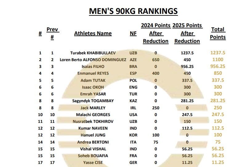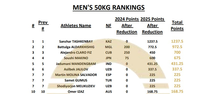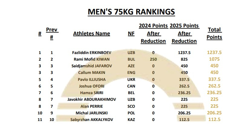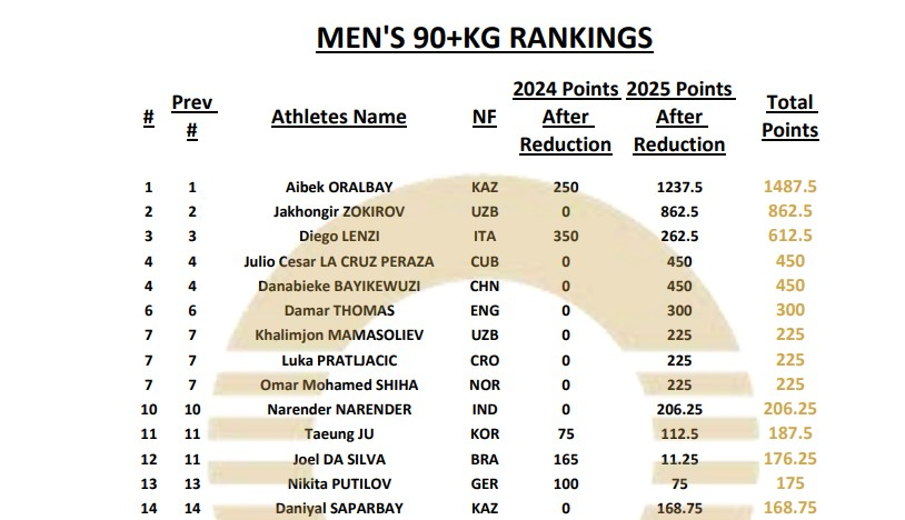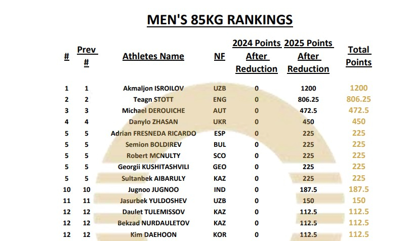 В весе до 85 килограммов пятым идет Султанбек Айбарулы, кроме того в списке присутствуют Даулет Толемисов и чемпион мира Бекзад Нурдаулетов.