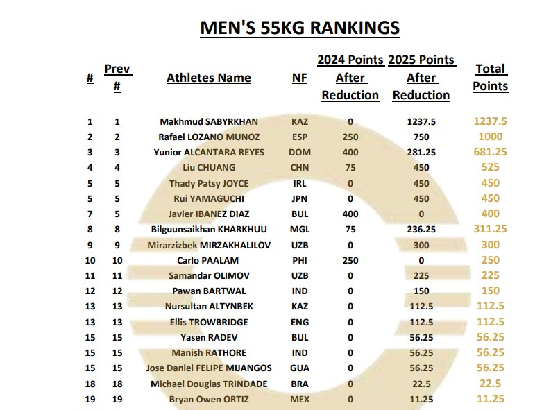 В весе до 55 килограммов первую строчку удерживает чемпион мира Махмуд Сабырхан, тогда как на 13-й позиции находится Нурсултан Алтынбек.