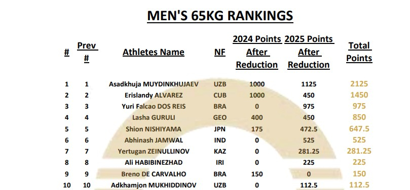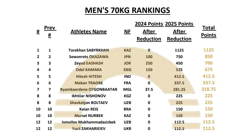 В дивизионе до 70 килограммов рейтинг возглавляет Торехан Сабырхан, а на десятой строчке расположился Нурбек Мурсал.