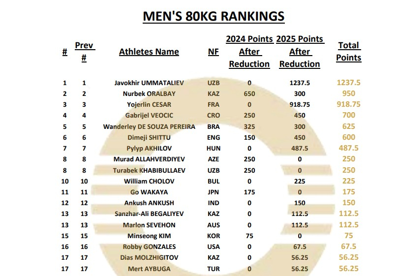 В категории до 80 килограммов вторую позицию занимает серебряный призер Олимпийских игр Нурбек Оралбай, также в рейтинге находятся Санжарали Бегалиев и Диас Молжигитов.
