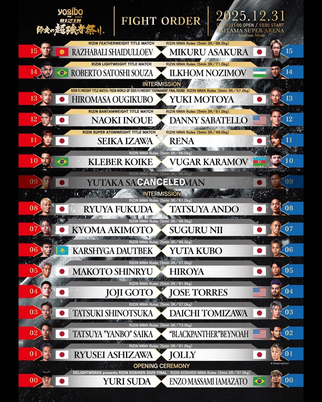 Турнир Rizin в Сайтаме начнется 31 декабря в 10:00 по казахстанскому времени. Каршыга и Кубо выйдут в седьмой паре, ориентировочное время - после 11:30.