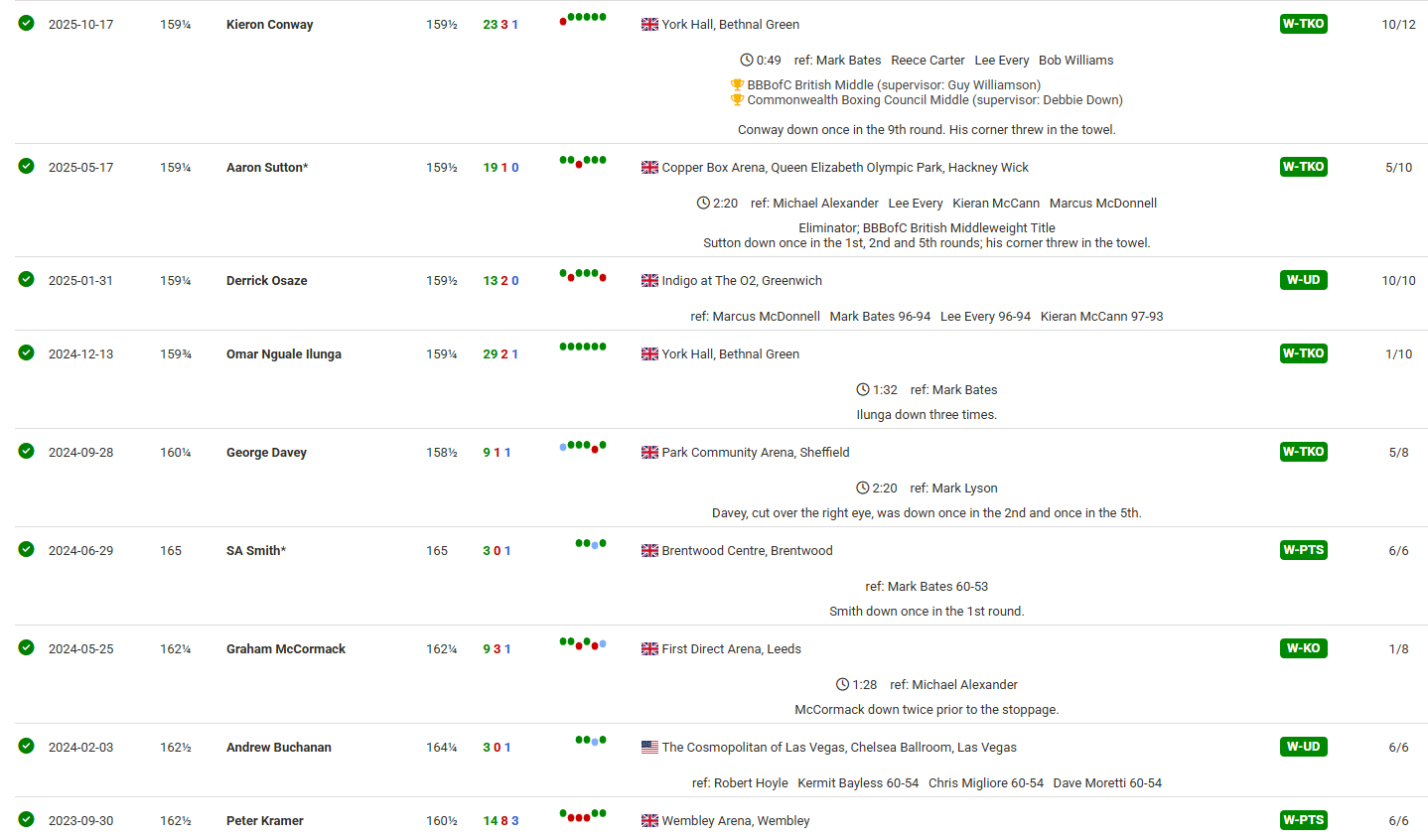 Поединок прошел на арене York Hall в Лондоне (Англия). В главном бою вечера Джордж взял верх над действующим чемпионом страны Кироном Конуэем (23-4-1, 7 КО), который впервые в карьере проиграл досрочно.