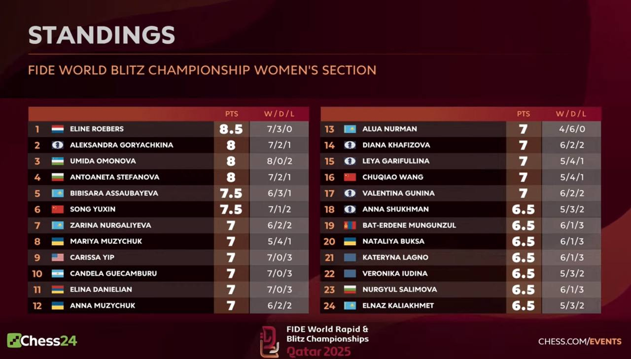 Две казахстанки в топ-10 после первого дня ЧМ-2025 по блицу, Асаубаева - в топ-5