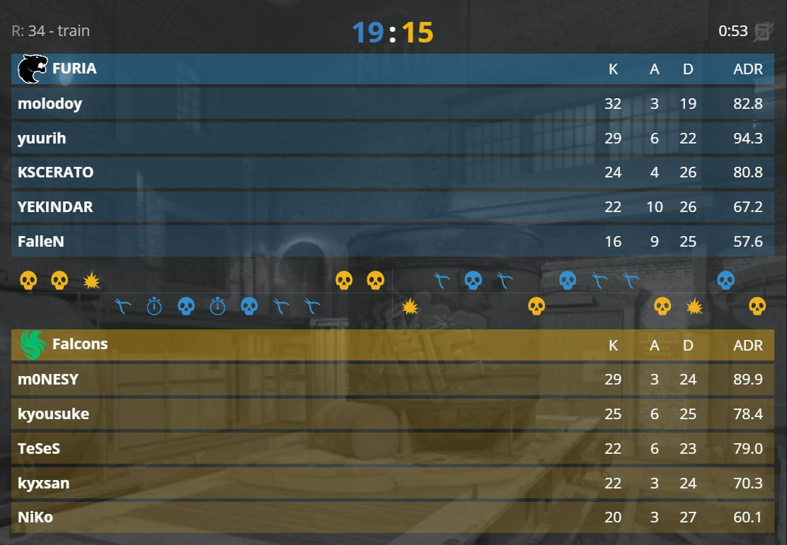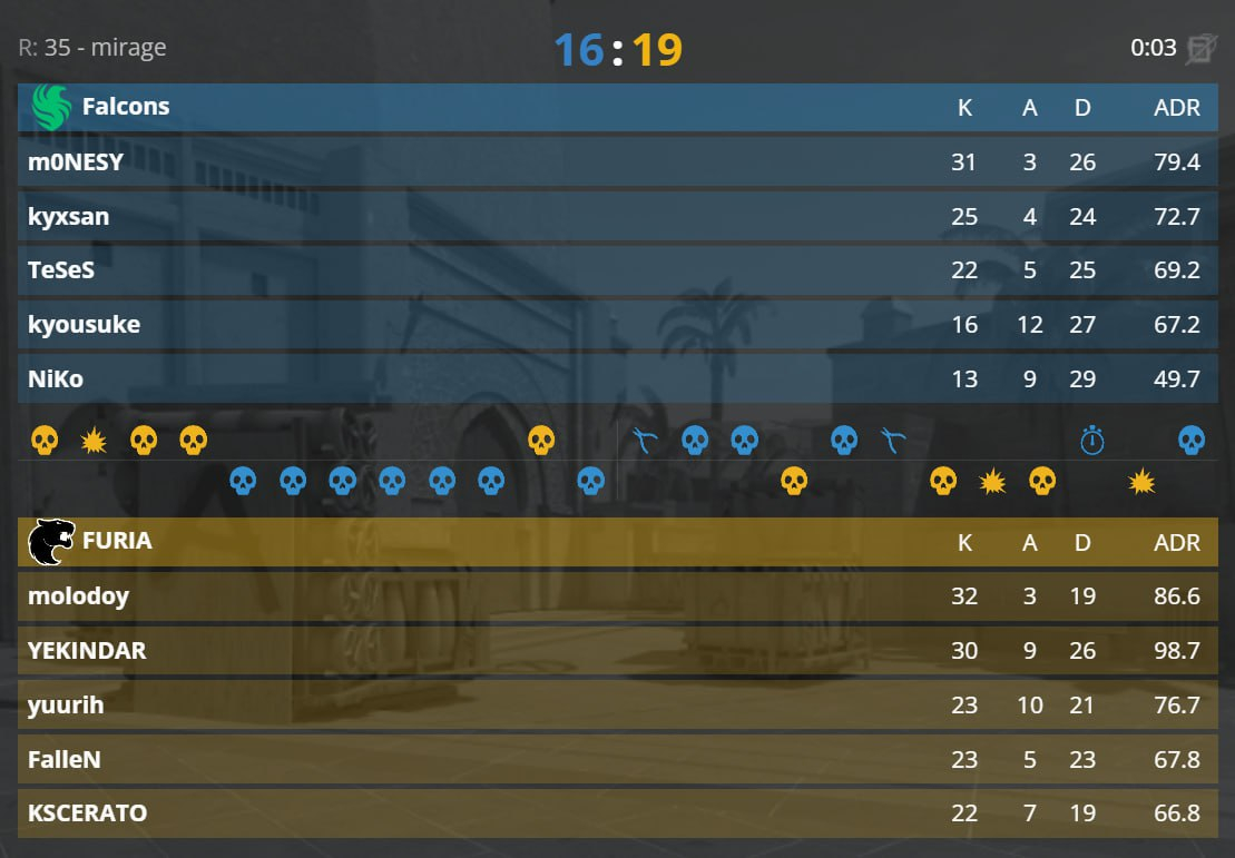 На Mirage molodoy выдал мощный индивидуальный перформанс (KDA 32-19-3), а сама игра ушла в напряжённый овертайм. В дополнительное время FURIA оказалась собраннее и закрыла звёздный состав Falcons, в котором выступают m0NESY, NiKo и kyosuke. Для бразильцев это уже третья победа подряд над Falcons.