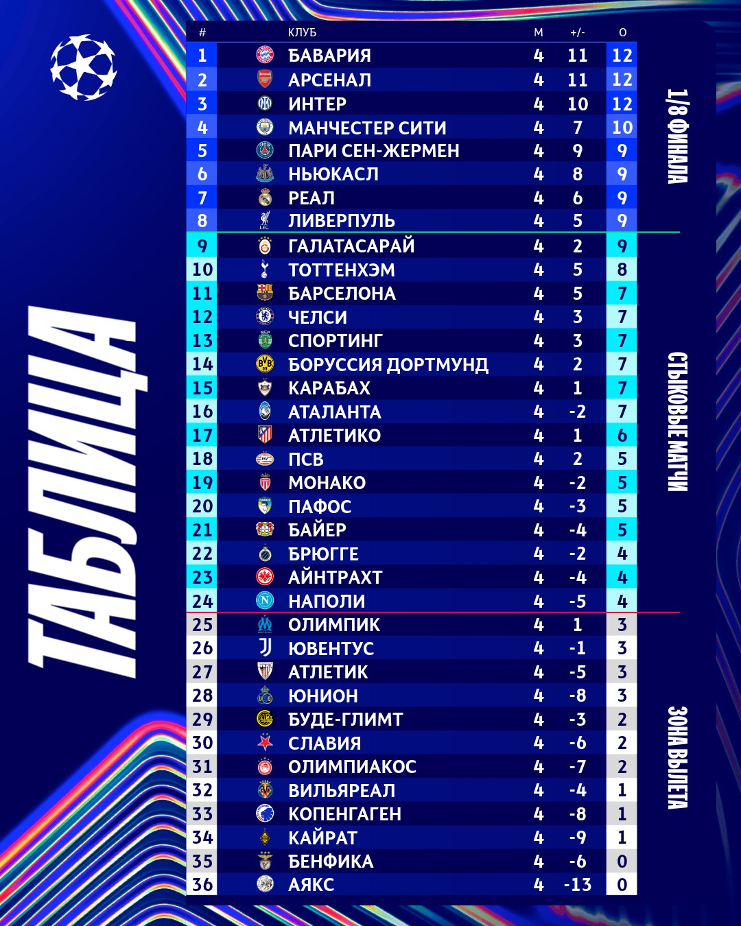 В 1/8 финала напрямую вышли "Арсенал", "Бавария", "Ливерпуль", "Тоттенхэм", "Барселона", "Челси", "Спортинг" и "Манчестер Сити".