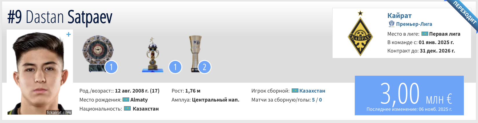 По итогам ноябрьского апдейта 17-летний форвард "Кайрата" Дастан Сатпаев стал самым дорогим футболистом Казахстана и КПЛ, его стоимость выросла на €1,2 млн и теперь составляет ровно €3 млн.