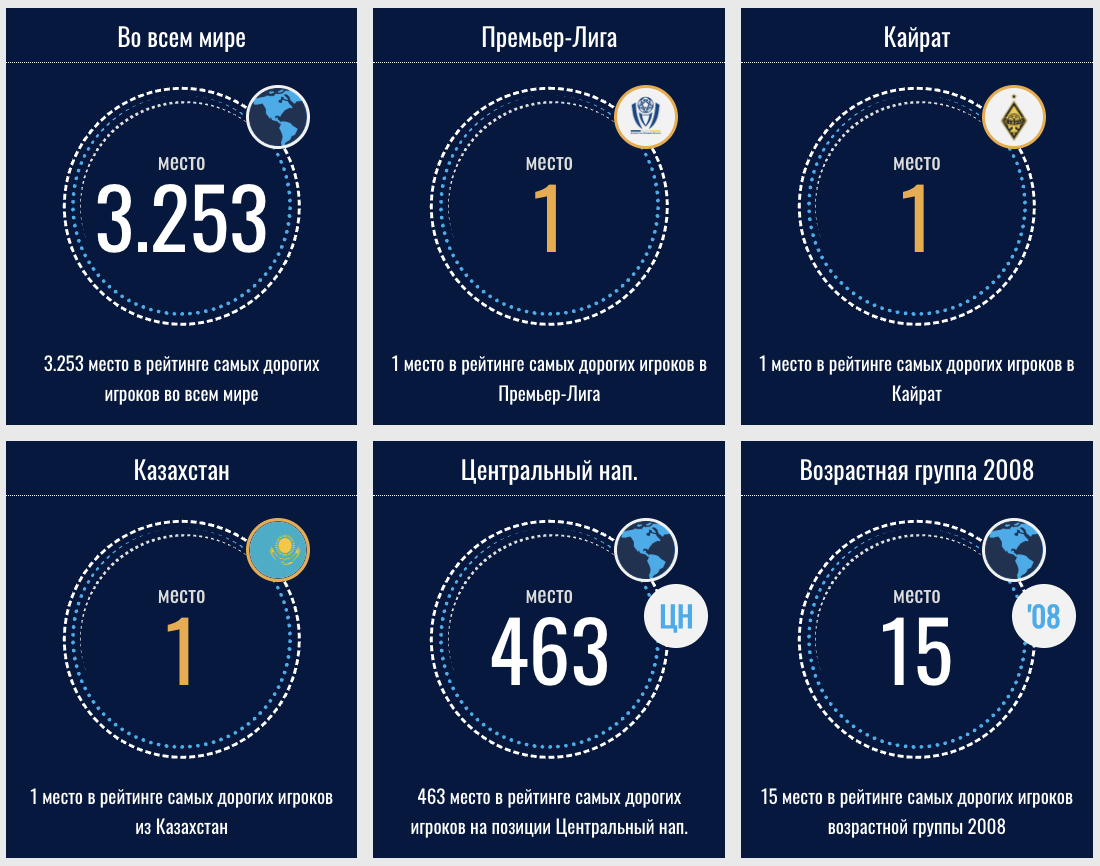 - 1 место в рейтинге самых дорогих игроков Казахстана;
