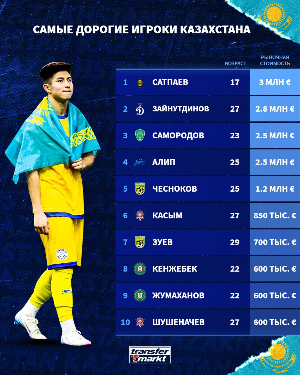 Сатпаев опередил в рейтинге таких игроков, как Бахтиёр Зайнутдинов ("Динамо", €2.8 млн), Максим Самородов ("Ахмат", €2.5 млн) и Нуралы Алип ("Зенит", €2.5 млн).