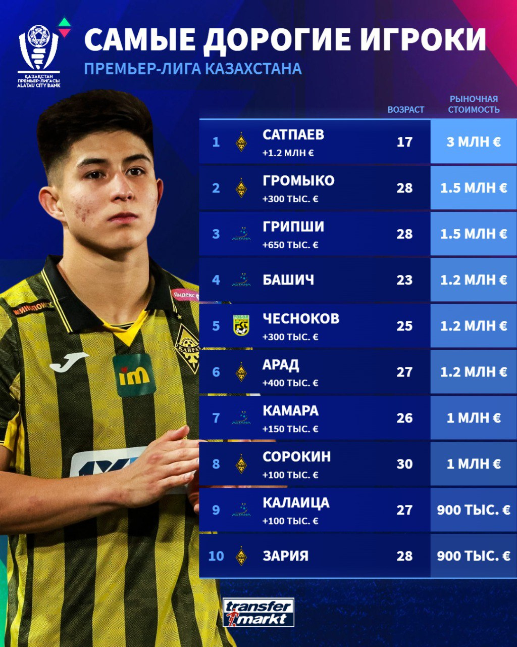Далее идут Иван Башич ("Астана"), Ислам Чесноков ("Тобол") и Офри Арад ("Кайрат"), чья стоимость составляет €1.2 млн.