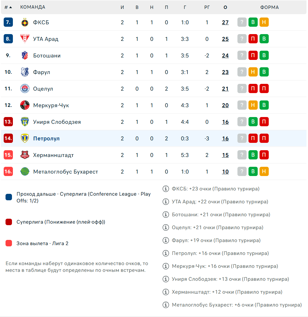 После 30 тура чемпионат Румынии поделился на две группы: одна играет за чемпионство и медали, вторая - за спасение от вылета. "Петролул" во второй и после двух матчей идет на 14-м месте из 16 команд - зона стыков.