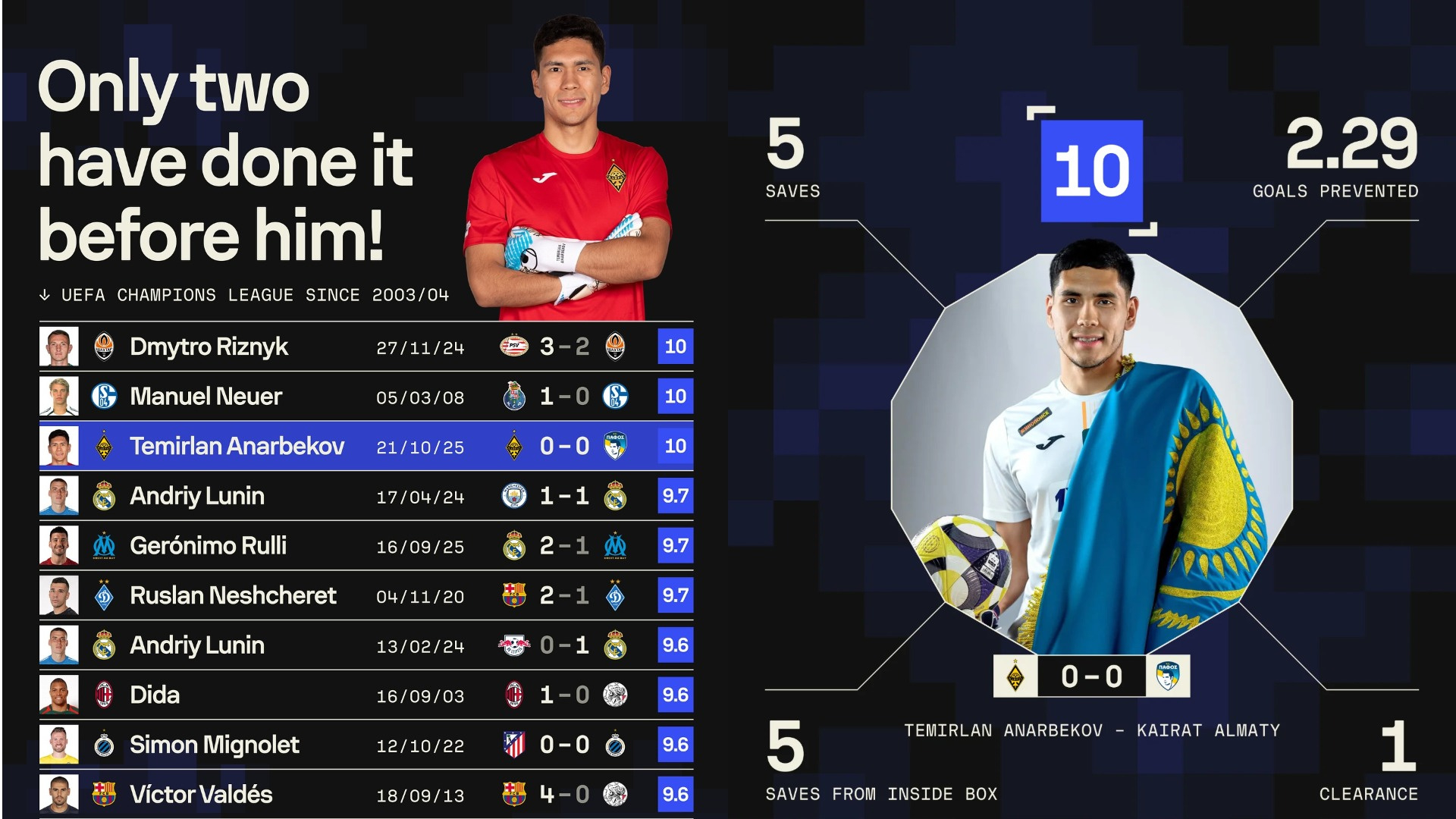 В матче Лиги Чемпионов против "Пафоса" (0:0) Анарбеков совершил пять невероятных сейвов и получил оценку 10 по версии SofaScore. Это позволило ему войти в список лучших, сравнявшись с достижением Мануэля Нойера в 2008 году за "Шальке" против "Порту" и Дмитро Рыжика, представлявшего украинский "Шахтер" в матче с ПСВ (2024).