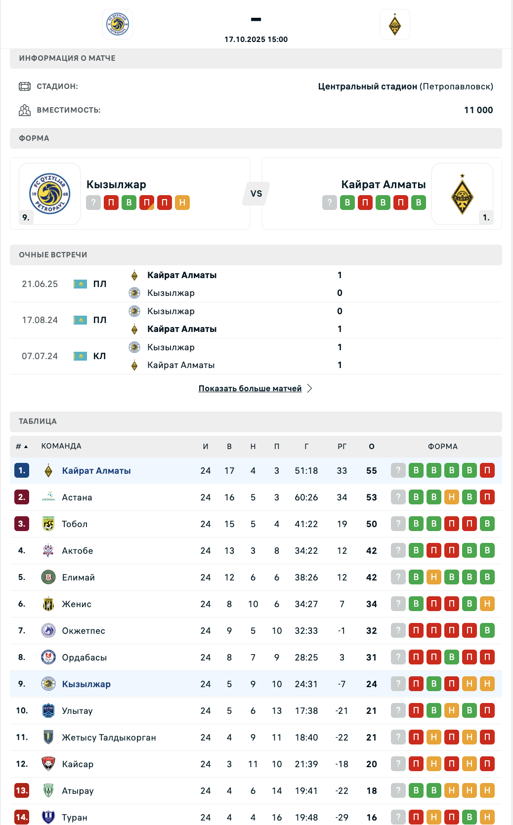 После 24 туров "Кайрат" возглавляет турнирную таблицу с 55 очками, а "Кызылжар" занимает девятое место с 24 баллами.