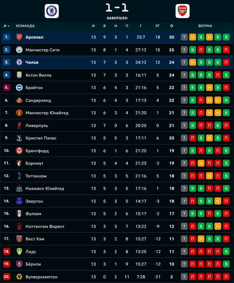 В центральном матче 13-го тура чемпионата Англии "Челси" и "Арсенал" не выявили победителя, сообщает Спорт Шредингера.