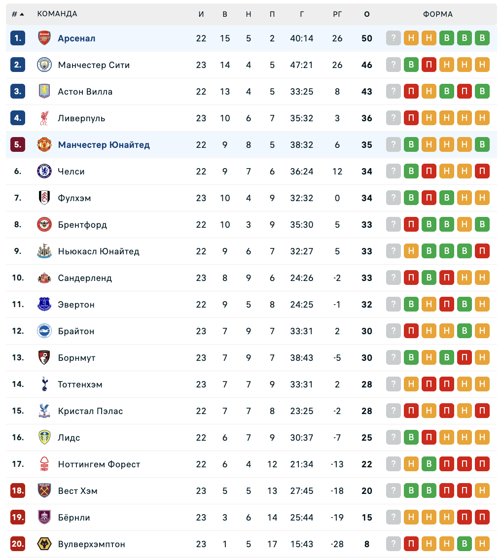 "Арсенал" лидирует в турнирной таблице АПЛ, набрав 50 очков после 22 матчей. Команда Микеля Артеты ведёт борьбу за чемпионский титул и опережает ближайших преследователей.