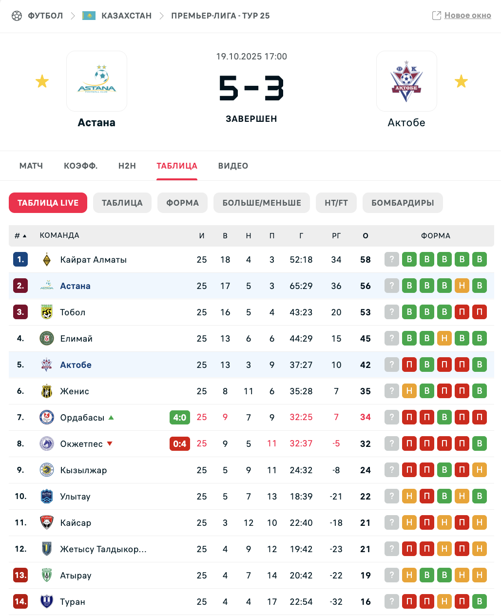 В предпоследнем, 25-м, туре КПЛ-2025 «Астана» одержала зрелищную победу над «Актобе» со счётом 5:3, сократив отставание от лидирующего «Кайрата» до минимума, сообщает Спорт Шредингера.