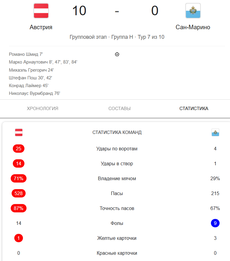После этой победы Австрия возглавила турнирную таблицу группы H с 15 очками, тогда как Сан-Марино остаётся на пятом месте без набранных очков.