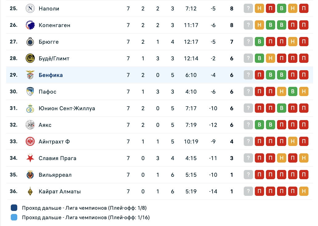 "Копенгаген" занимает 26-е место - 8 очков. Датская команда продолжает борьбу за попадание в зону плей-офф.