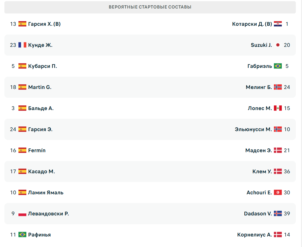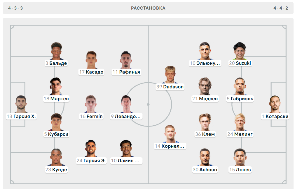 "Барселона": Жоан Гарсия; Кунде, Кубарси, Мартин, Бальде; Эрик Гарсия, Ольмо; Ямаль, Фермин Лопес, Рафинья; Ферран Торрес