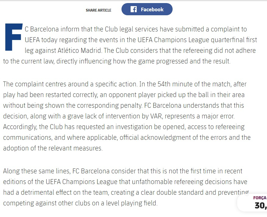 "Барселона" информирует, что юридический департамент клуба подал официальную жалобу в УЕФА в связи с событиями в первом матче четвертьфинала Лиги чемпионов УЕФА против "Атлетико". Клуб считает, что действия судьи противоречили действующему регламенту, что непосредственно повлияло на ход матча и его исход.