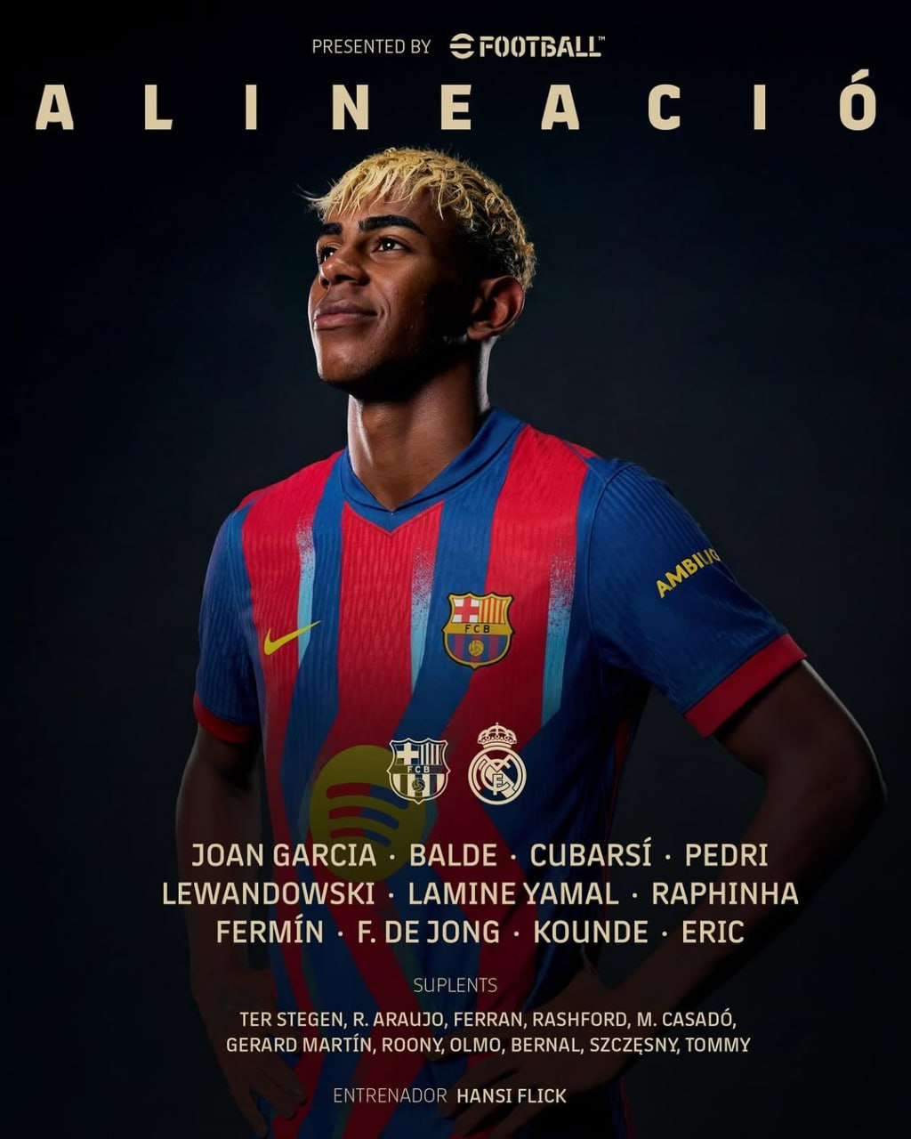 Стартовый состав "Барселоны": Жоан Гарсия, Жюль Кунде, Пау Кубарси, Эрик Гарсия, Алехандро Бальде, Педри, Френки де Йонг, Фермин Лопес, Ламин Ямаль, Рафинья, Роберт Левандовски.