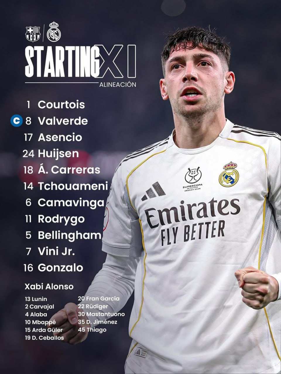 Стартовый состав "Реала": Тибо Куртуа, Дин Хёйсен, Рауль Асенсио, Федерико Вальверде, Альваро Каррерас, Орельен Тчуамени, Эдуардо Камавинга, Джуд Беллингем, Родриго, Винисиус Жуниор, Гонсало Гарсия.