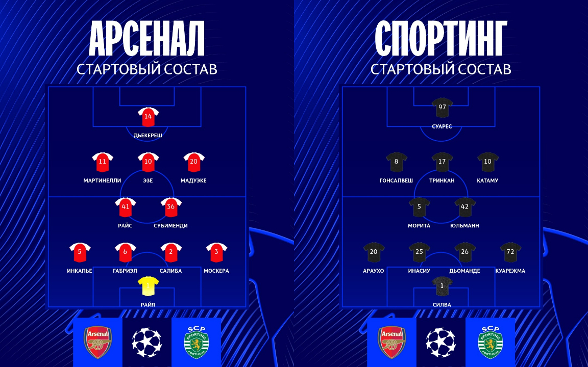 Стартовый состав "Спортинга": Силва, Морита, Гонсалвеш, Катамо, Тринкан, Араухо, Инасиу, Дьоманде, Юльманн, Куарежма, Суарес.