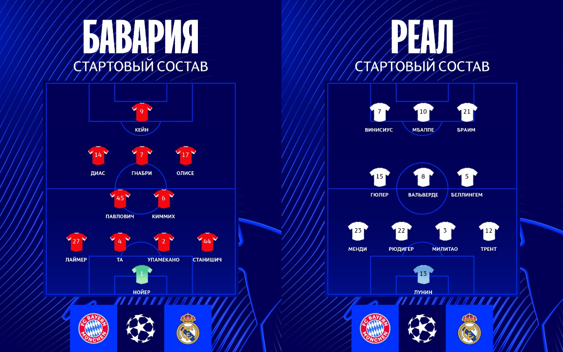 Команды обменялись быстрыми голами: у "Реала" на первой минуте забил Арда Гюлер, а "Бавария" ответила точным ударом Александара Павловича на шестой.