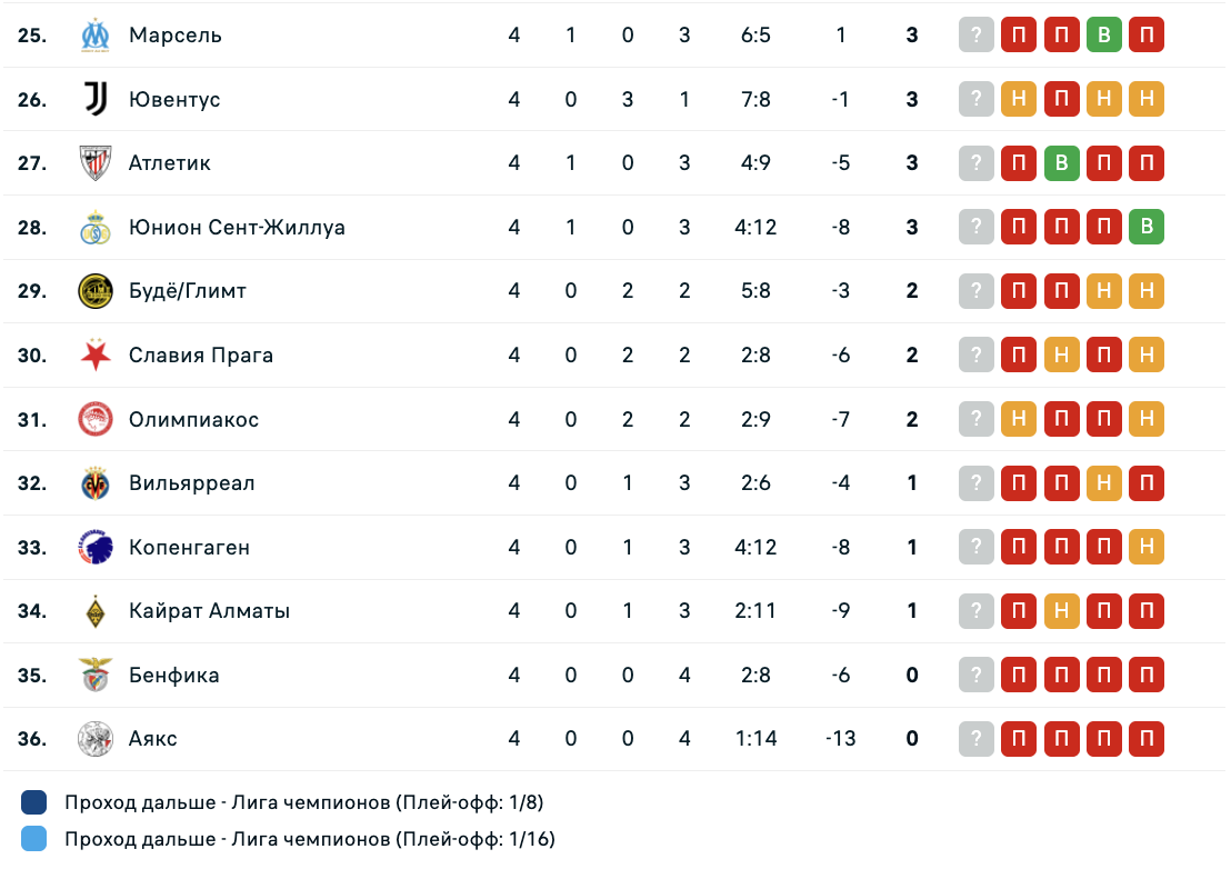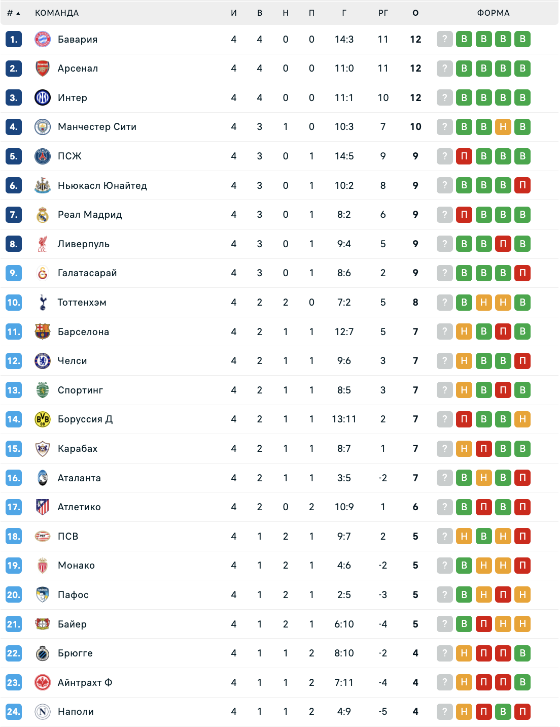 Турнирная таблица общего этапа Лиги чемпионов после 4-го тура:
