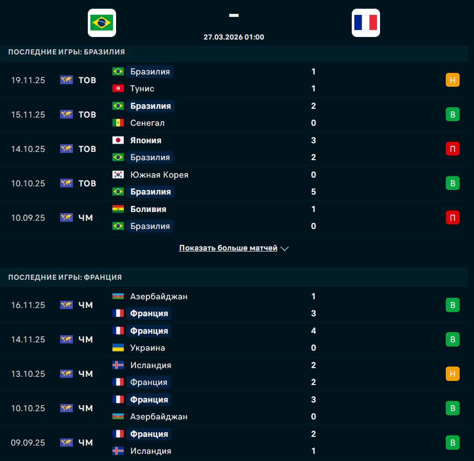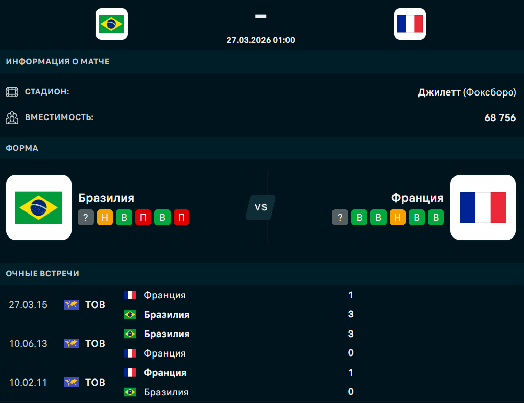 В ночь с 25 на 26 марта состоится товарищеский матч, в котором встретятся сборные Бразилии и Франции, сообщает Спорт Шредингера.