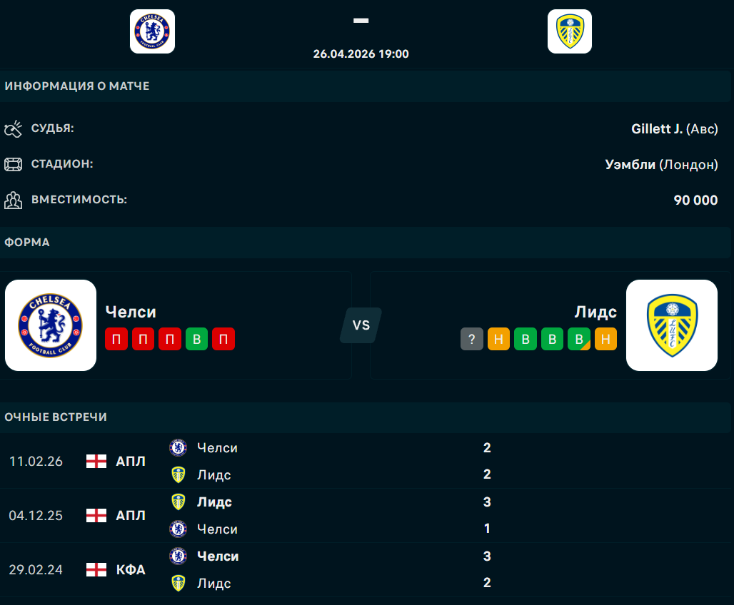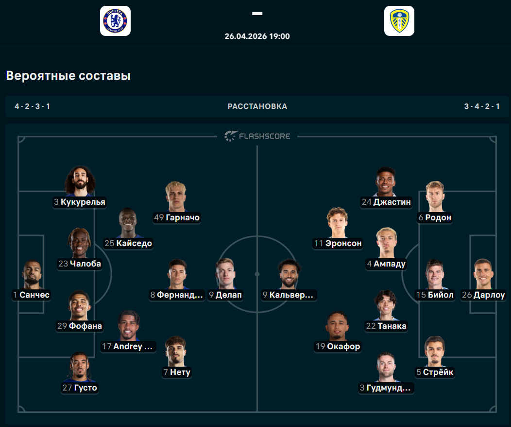Сегодня, 25 апреля, состоится матч 34-го тура английской премьер-лиги, в котором "Челси" сыграет с "Лидсом", сообщает Спорт Шредингера.