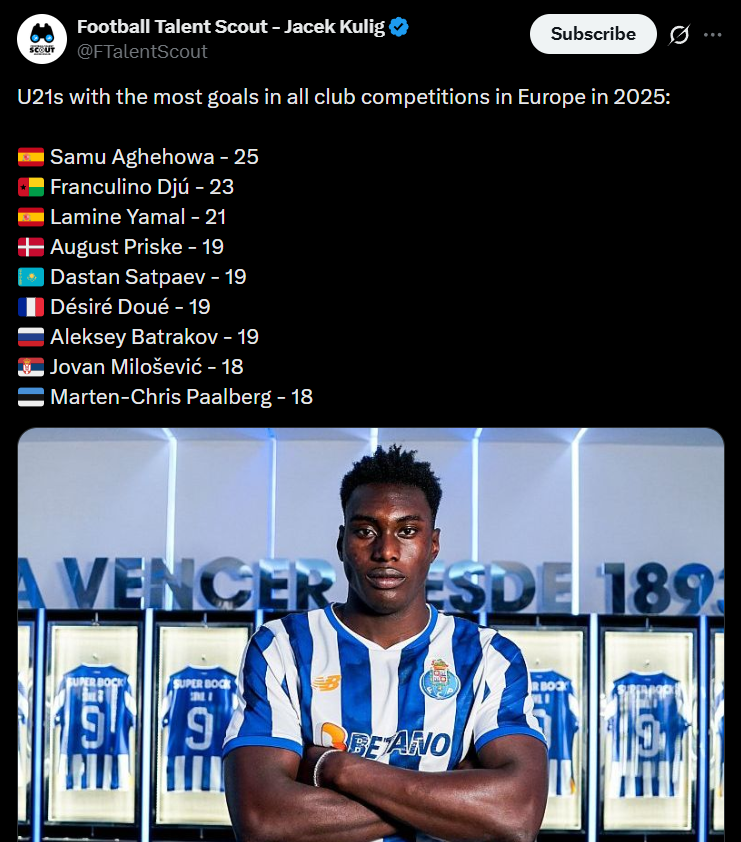 Самым забивным оказался испанский форвард "Порту" - Саму Агуэхова. На его счету 25 мячей. На второй строчке нападающий датского "Мидтьюланда" из Гвинеи Франкулину Джу с 23 голами. Тройку лидеров закрывает испанская звезда "Барселоны" - Ламин Ямаль, у которого 21 точный выстрел.