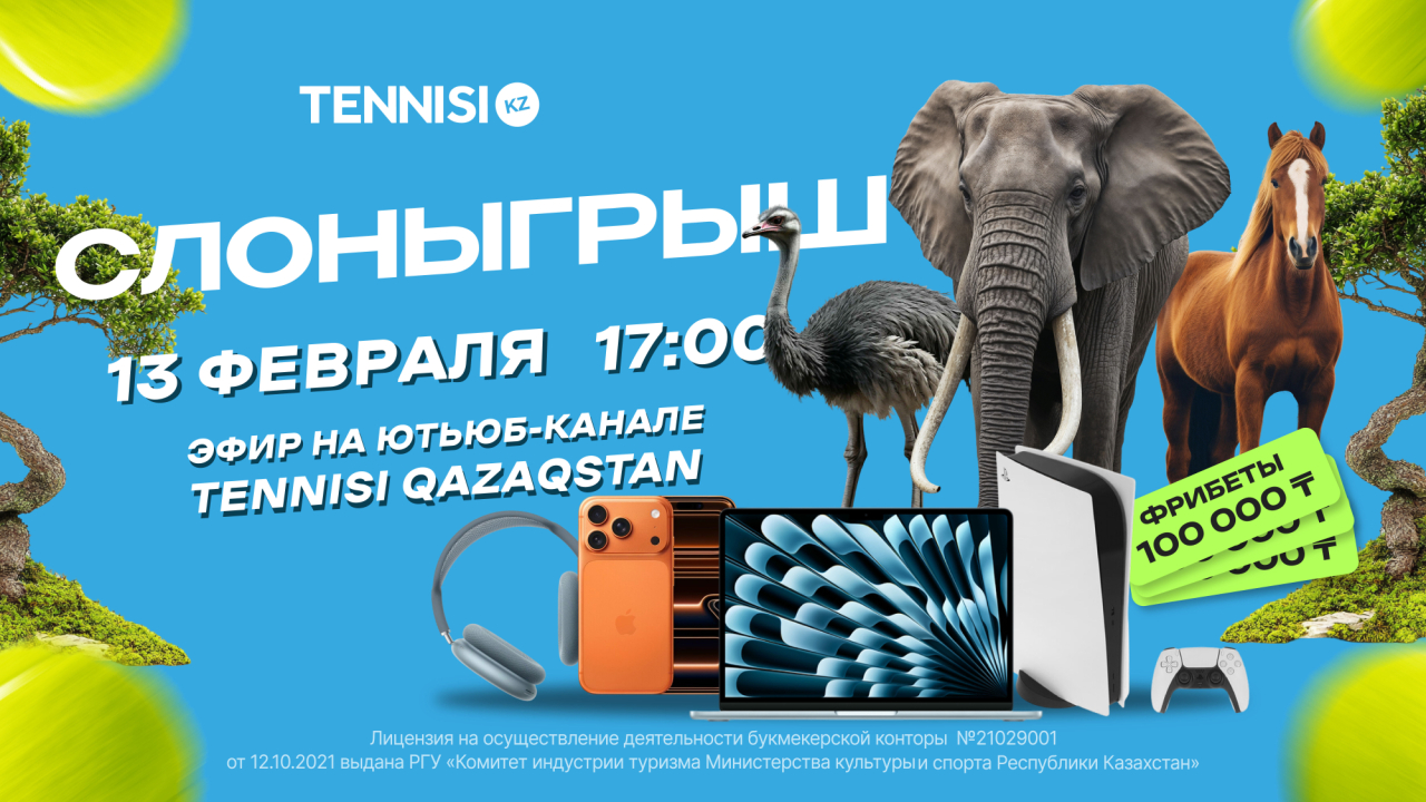 13 февраля в 17:00 на ютьюб-канале Tennisi Qazaqstan подведут итоги масштабной акции "Слоныгрыш" с призовым фондом 65 000 000 тенге, которая стартовала ещё осенью.