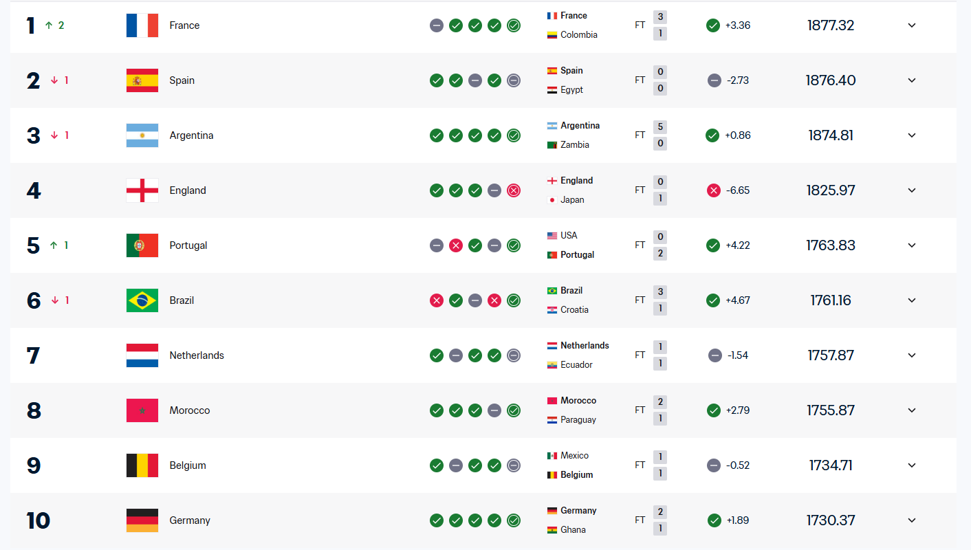 Французы поднялись сразу на две позиции. Также Португалия и Бразилия поменялись местами - с 5-го на 6-е. Остальные команды в топе остались без изменений.