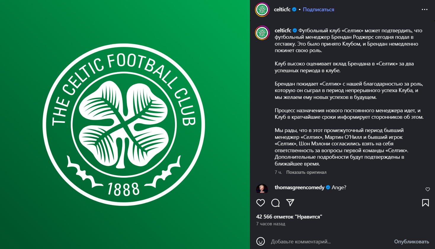 Клуб высоко ценит вклад Брендана в развитие "Селтика" за два очень успешных периода его работы. Брендан покидает "Селтик" с нашей благодарностью за ту роль, которую он сыграл в период непрерывного успеха клуба, и пожеланиями ему успехов в будущем.
