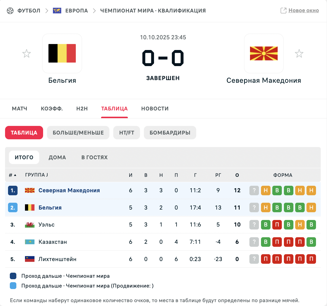После нулевой ничьей Бельгии и Северной Македонии (0:0) положение в группе J отборочного турнира к чемпионату мира-2026 стало максимально напряжённым, сообщает Спорт Шредингера.