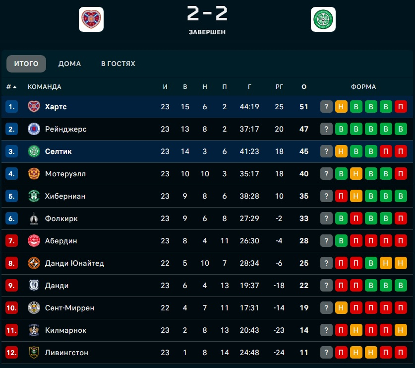 В таблице чемпионата Шотландии "Хартс" лидирует, "Селтик" отстает на 6 очков. В следующем матче "Хартс" сыграет с "Данди Юнайтед" на выезде.