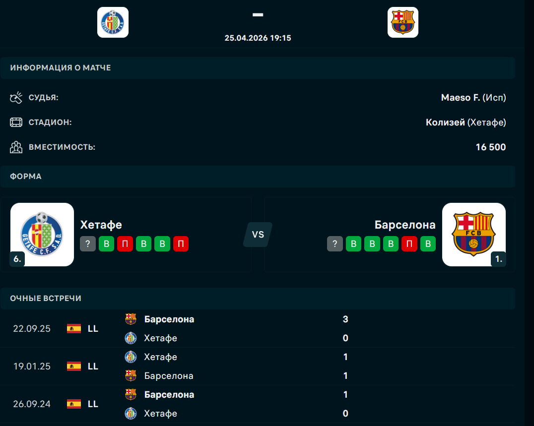 Сегодня, 25 апреля, состоится матч 32-го тура примеры испанской Ла Лиги, в котором "Хетафе" дома сыграет с "Барселоной", сообщает Спорт Шредингера.