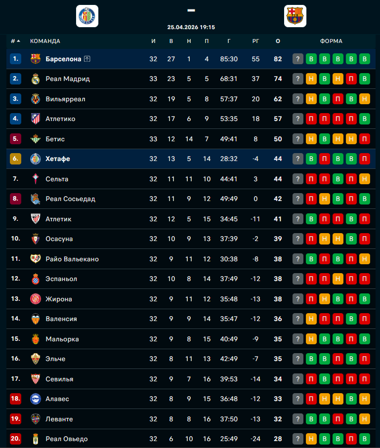 - "Хетафе" с 44 баллами занимает шестое место и ведет борьбу за попадание в еврокубковую зону.