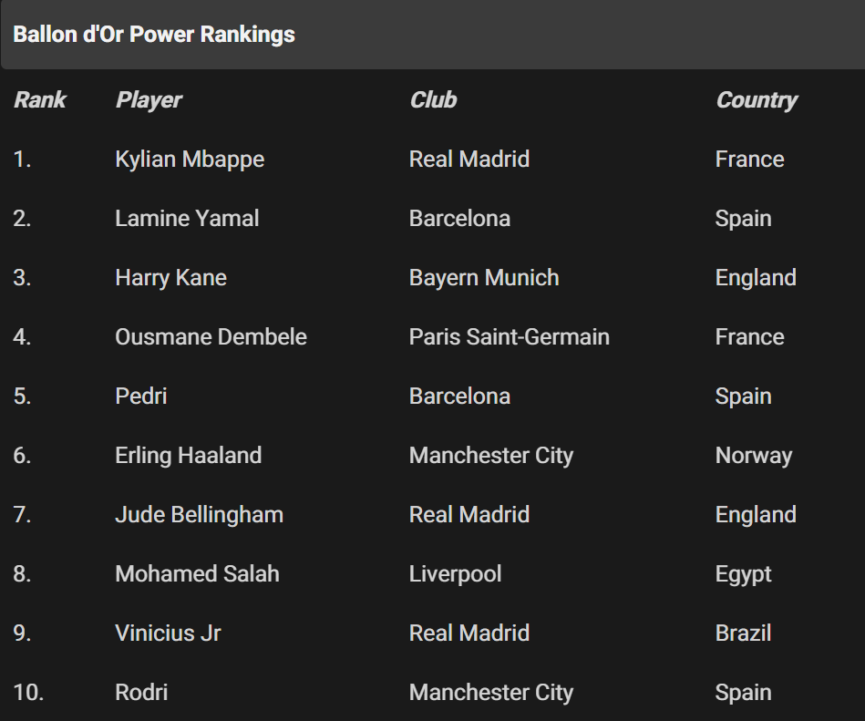По данным портала Give me Sport француз является главным претендентом на трофей. На втором месте юная звезда "Барселоны" Ламин Ямаль. Третью позицию занял нападающий "Баварии" Гарри Кейн.