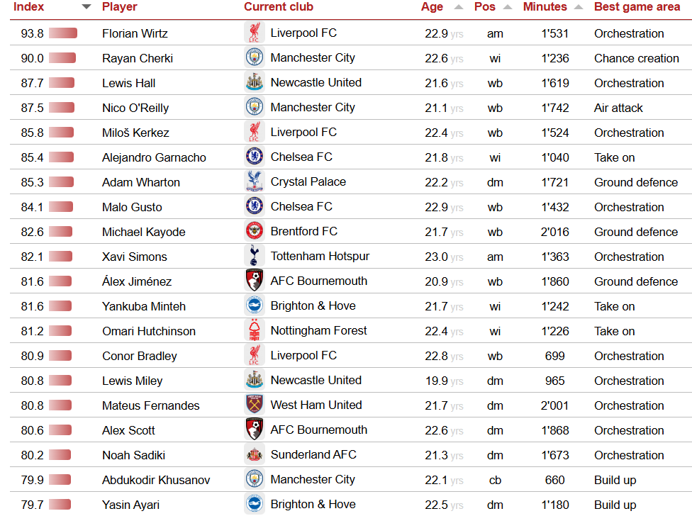 Лидером рейтинга среди игроков до 23 лет в АПЛ стал полузащитник "Ливерпуля" Флориан Виртц. Второе место занял Райан Шерки из "Манчестер Сити", а третье - Льюис Холл, выступающий за "Ньюкасл Юнайтед".
