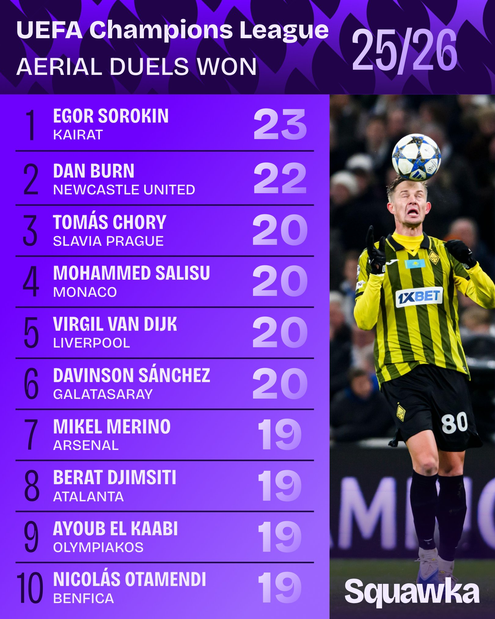 Российский защитник "Кайрата" Егор Сорокин стал лидером Лиги чемпионов по выигранным верховым единоборствам в основном раунде турнира, сообщает Спорт Шредингера.
