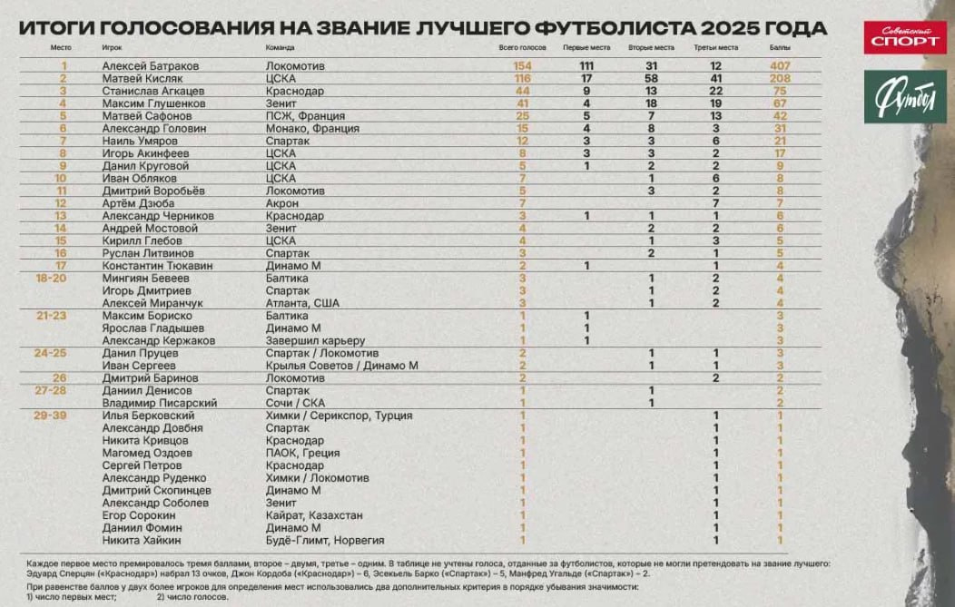 Первое место получил Максим Батраков из "Локомотива", на втором месте оказался Матвей Кисляк из ЦСКА, а замкнул тройку сильнейших Станислав Агкацев из "Краснодара".