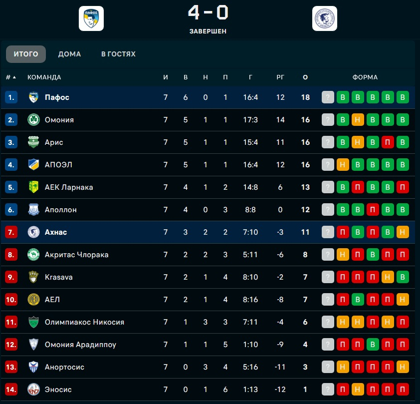 В таблице чемпионата Кипра "Пафос" лидирует с небольшим запасом, одержав шесть побед в семи играх. Основные конкуренты "АПОЭЛ" и "Омония" отстают на два балла.