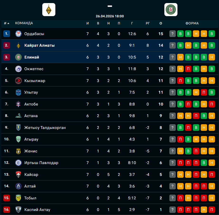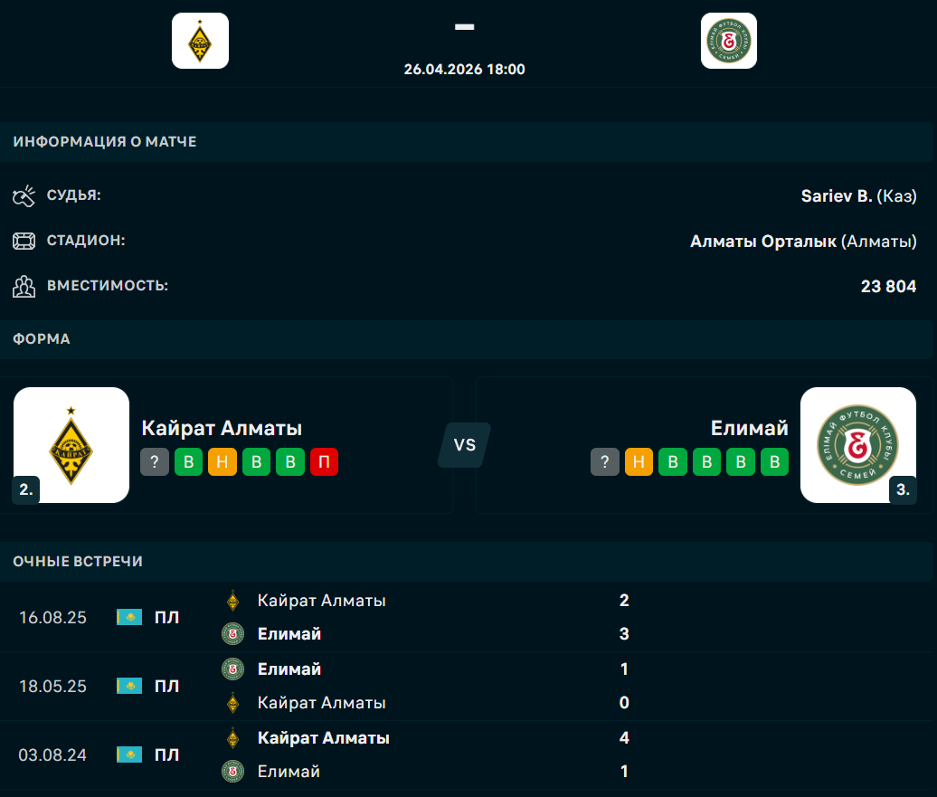 Сегодня, 26 апреля, алматинский "Кайрат" сыграет дома против "Елимая" из Семея в седьмом туре казахстанской премьер-лиги, сообщает Спорт Шредингера.