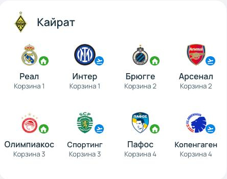 - Кайрат: Реал, Интер, Брюгге, Арсенал, Олимпиакос, Спортинг, Пафос, Копенгаген