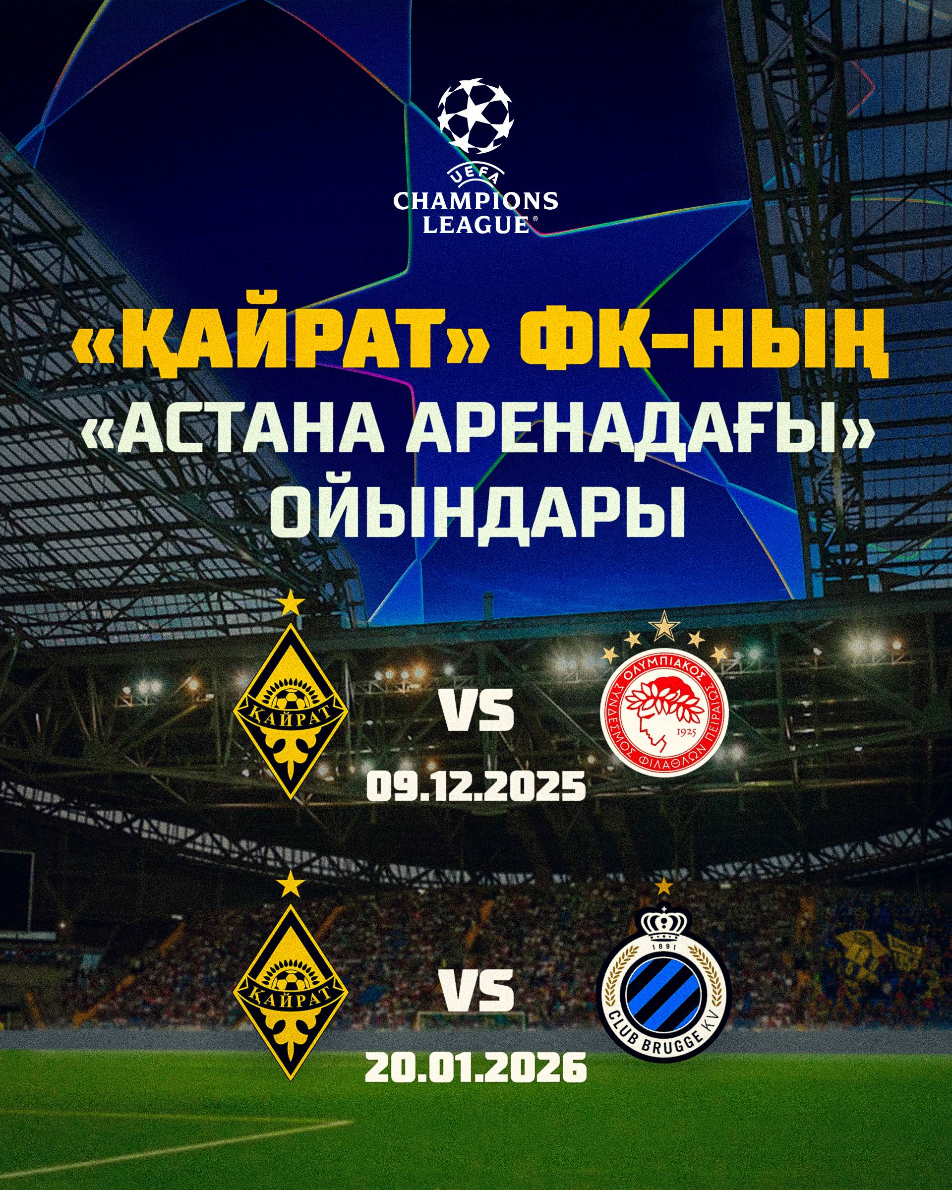 "Кайрат" объявил о переносе двух домашних матчей Лиги чемпионов на "Астана Арену"