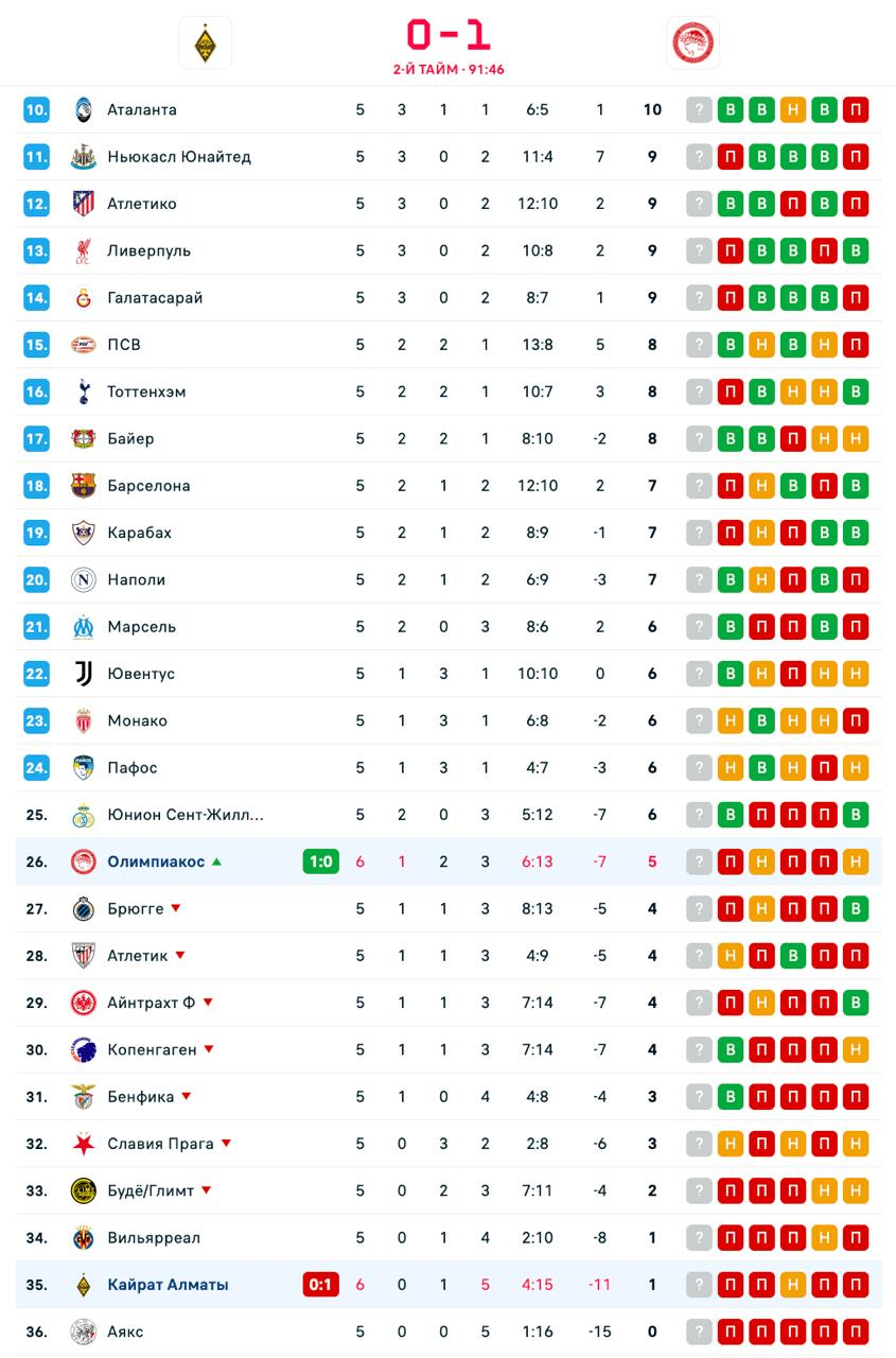 ⚽️ "Олимпиакос" выиграл первый матч в нынешней Лиге чемпионов, а "Кайрат" потерпел пятое поражение.